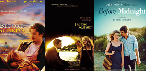 還有一部講述從相遇到重逢直至終成眷屬的愛情三部曲系列電影。1995年,第一部《愛在黎明破曉前》講述美國青年杰西(伊桑·霍克)在火車上偶遇了法國女學生塞琳娜(朱莉·德爾佩),兩人相談甚歡並迅速墜入愛河,臨分別時相約半年后再見。第二部《愛在日落黃昏時》承接上部的故事,講述九年之后已經成為暢銷書作家的杰西與在法國某環境保護組織工作的塞琳娜在巴黎再次相遇,但是他們已經各自有了家庭,二人在一起度過了短暫而美好的時光。如果說前兩部講的還是愛情,那麼2013年的第三部《愛在午夜降臨前》開始講述人生和生活。這對總是不期而遇的戀人在希臘再次相遇,“在有了最美的相遇和最幸運的重逢之后,愛情的下一步隻能是生活了。”(綜合)