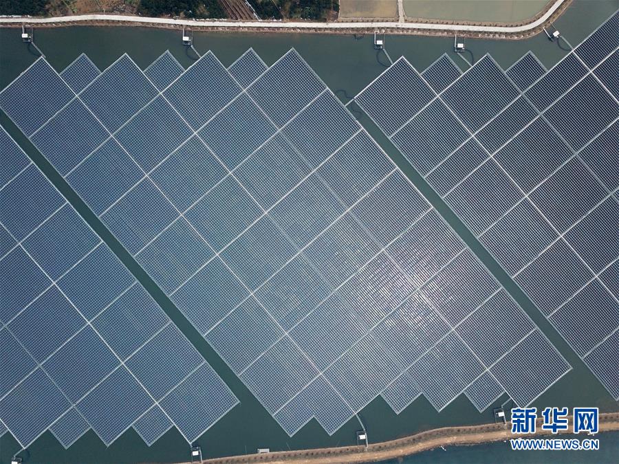 這是位於浙江省建德市三江口區域的漂浮式光伏電站(2月1日無人機拍攝)。