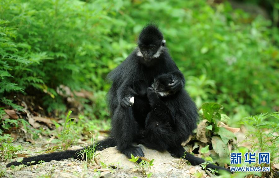 這是在麻陽河國家級自然保護區大河壩觀測點拍攝的黑葉猴及幼崽(5月17日攝)。新華社發(楊文斌 攝)