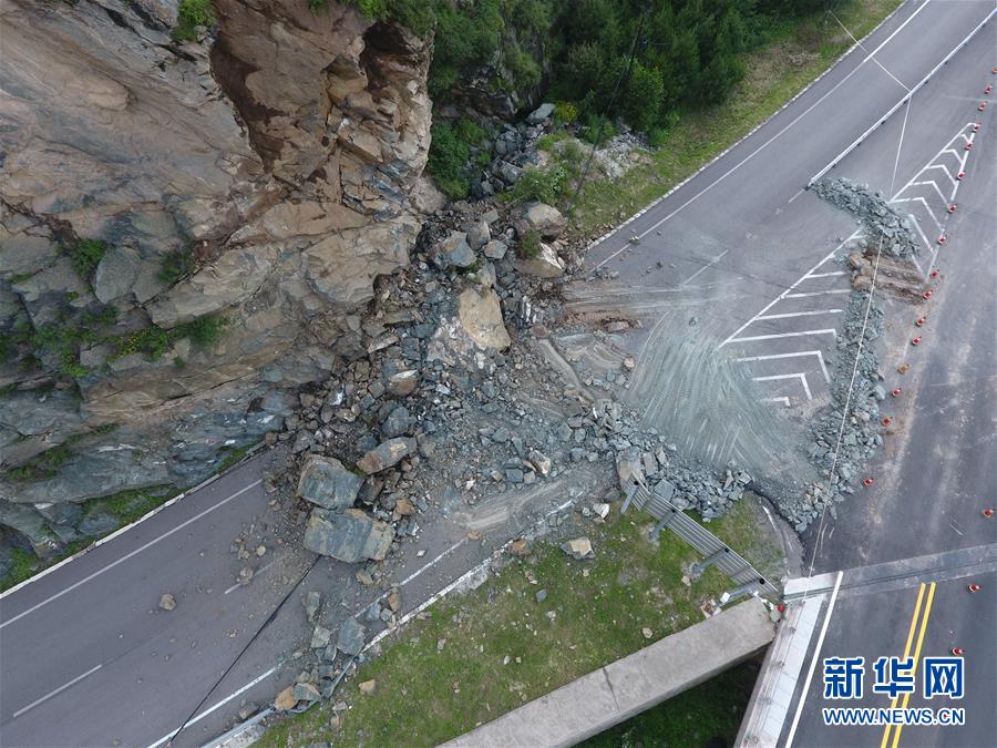 這是五台山景區大甘河橋一側的山體崩塌現場(7月21日攝)。 受降雨影響,山西五台山景區於7月19日和20日發生兩起山體崩塌地質災害,沒有造成人員傷亡和車輛損失。 新華社發(楊晨光 攝)