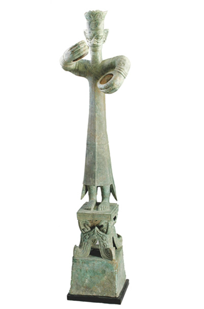 三星堆出土的一批青銅人物造像可謂絕世精品,它們既是神靈的象征,又是人間統治集團的代表。商代青銅大立人是三星堆文物中又一件舉世矚目的重器。它通高260.8厘米,分人像和底座兩部分,人像高180厘米,頭戴高冠,身穿窄袖衣,腳戴足鐲,雙手環握中空,環抱胸前,形象典重庄嚴。它似乎表現的是一個具有通天異稟、神威赫赫的大人物正在作法。