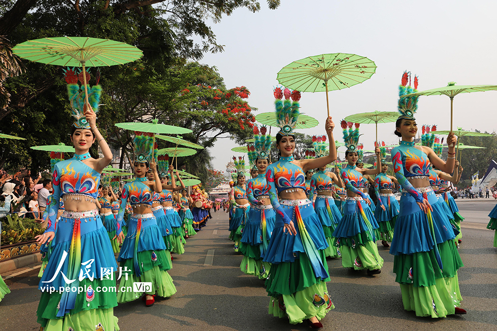 2023年4月14日,雲南省西雙版納傣族自治州在州府景洪市舉辦民間民族文化大游演,慶祝一年一度的傣歷新年,城區主干街道上身著節日盛裝的各族群眾載歌載舞,向市民和游客展示西雙版納各民族的傳統文化。李雲生攝(人民圖片網)