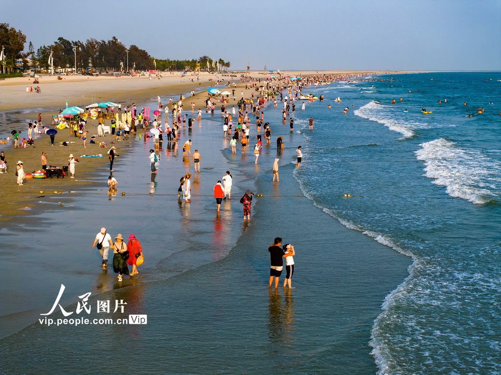 2025年4月23日,廣西北海市銀灘天然浴場,游客踏浪戲水,樂享清涼。何華文攝(人民圖片網)
