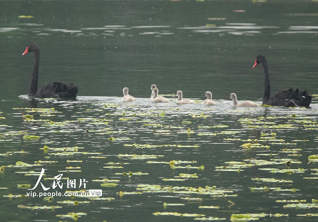 2025年5月8日,在北京圓明園景區湖面,黑天鵝帶領六隻幼崽游弋覓食,其樂融融。龔文豹攝(人民圖片網)