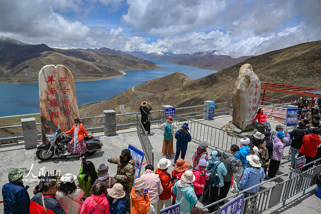 初夏時節,位於西藏山南市的羊卓雍措風景如畫,吸引眾多游客前來觀湖賞景。郭立亮攝(人民圖片網)