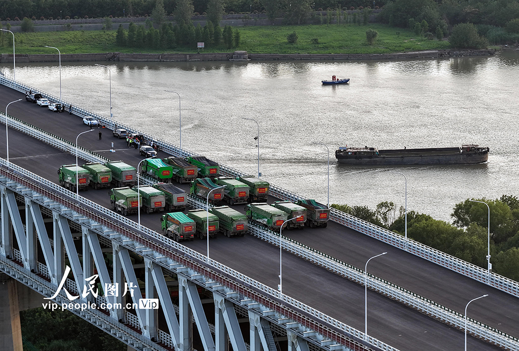 2025年6月16日,常泰長江大橋開始進行靜態荷載試驗,數十輛負載砂石的大型貨車有序行駛到固定位置進行對稱加載、偏心加載檢測,檢驗橋梁結構受力性能和實際承載能力,為橋梁竣工驗收提供科學依據。湯德宏攝(人民圖片網)