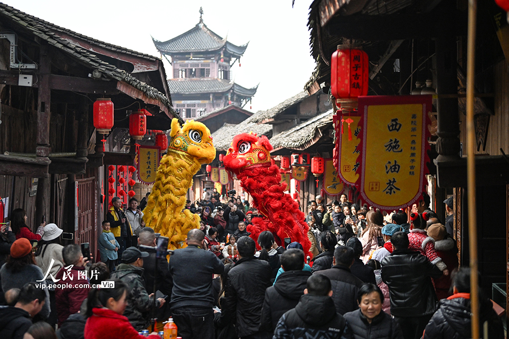 2026年2月10日,四川南充周子古鎮暖意融融,返鄉游子與鄉親歡聚一堂,觀看舞獅表演,共迎新春。由當地居民自發組織的35桌“團年宴”熱鬧開席,大家品嘗家鄉味,暢敘鄰裡情。李向雨攝(人民圖片網)