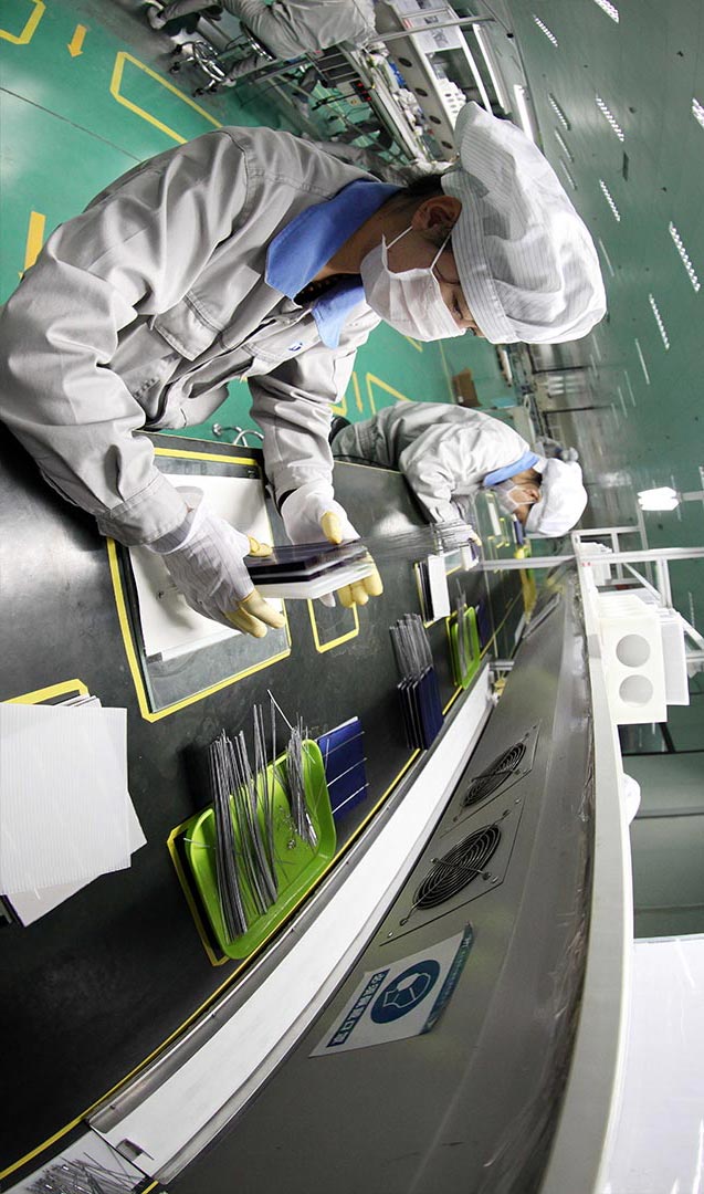 江苏赣榆经济开发区一家能源公司的工人在生产出口欧洲的太阳能光伏产品。