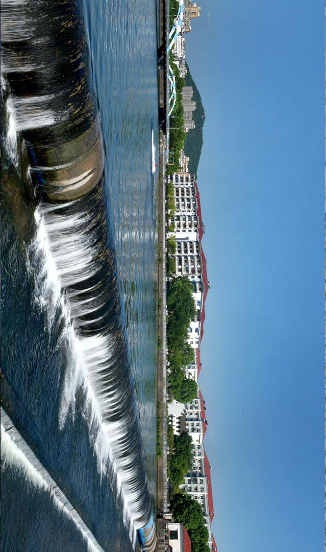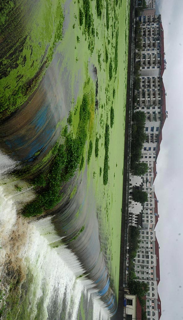 大量水葫芦伴着浊水从浙江武义穿城而过的熟溪河橡皮坝冲向下游。