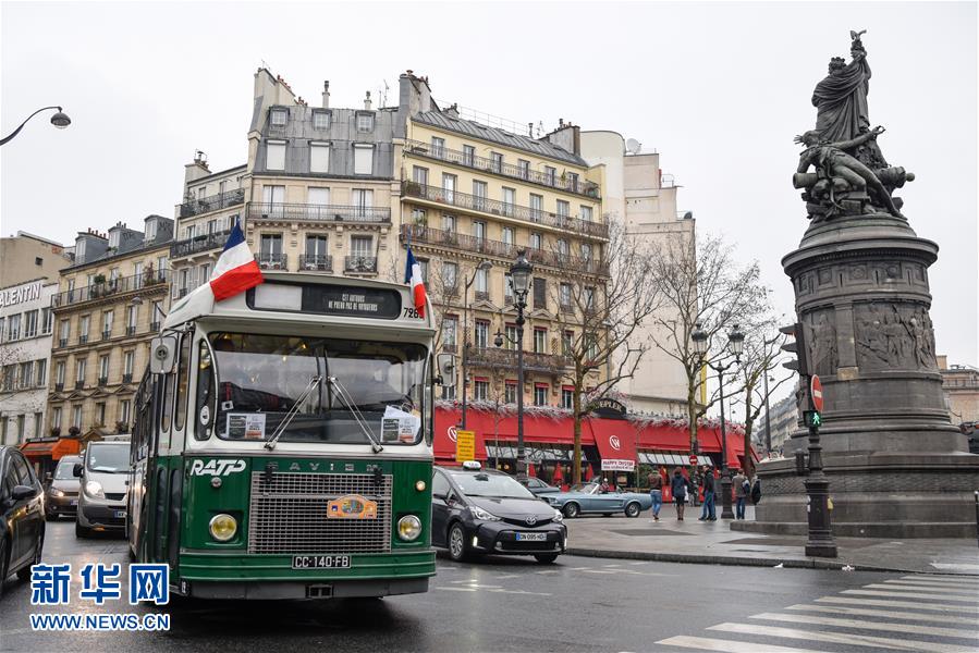 1月8日,一辆老式公交车驶过法国巴黎克利希广场。新华社记者陈益宸摄