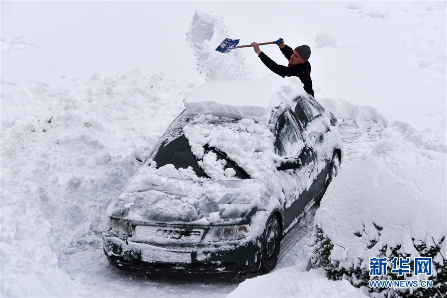 1月13日,在德国中部维林根,一名男子清理覆盖在汽车上的积雪。近日,一场冬季强风暴席卷德国,带来大风和降雪天气,造成部分地区建筑损坏,交通受阻,影响了人们的出行和生活。 新华社/法新