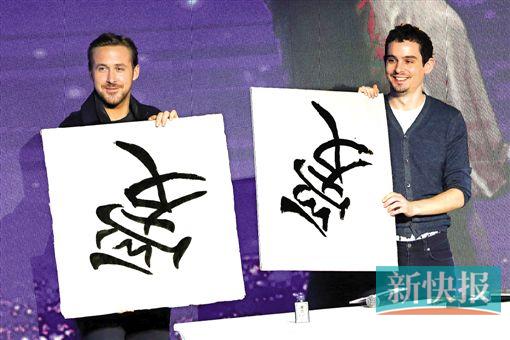 年度浪漫爱情电影《爱乐之城》24日在京举办首映礼,男主角瑞恩·高斯林(高司令)、导演达米恩·查泽雷空降北京,两人大展书法才华现学现写“爱”,默契十足。