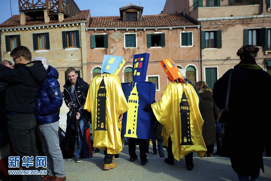 2月12日,在意大利水城威尼斯,狂欢者从一座桥上走过。 本届威尼斯狂欢节于2月11日开幕,将持续至2月28日。 新华社记者金宇摄