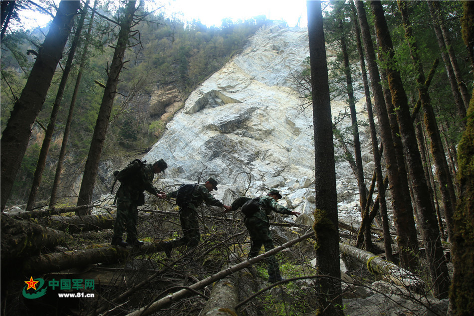 官兵们行走在倒木丛中。