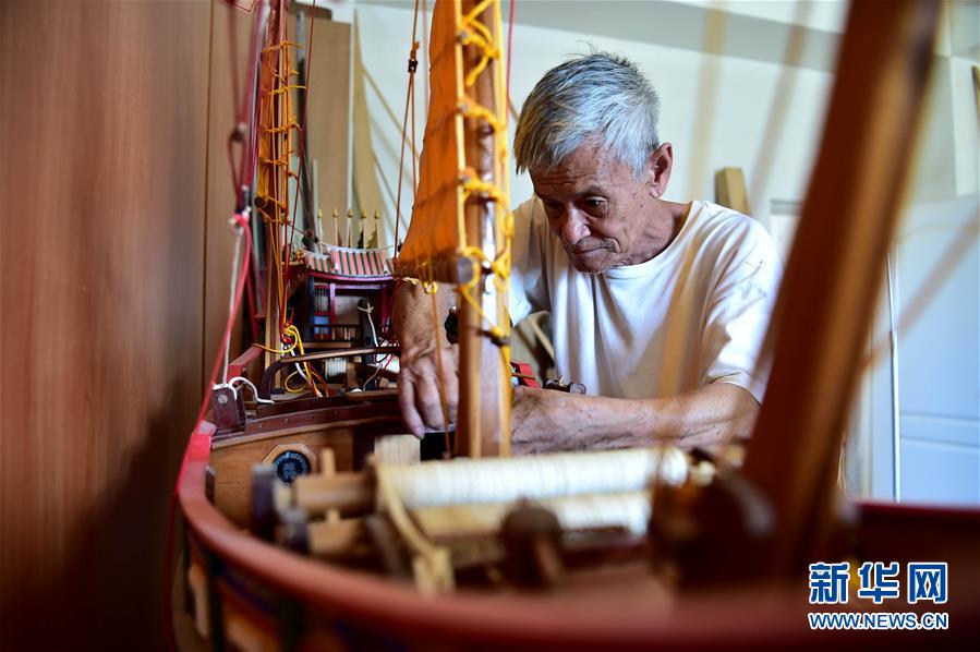 6月8日,王旭辉在澎湖的工作室内检查即将送往博物馆收藏的古船。今年67岁的王旭辉是台湾澎湖的一名古船建造师,家族第三代手艺传人。王旭辉家族的造船手艺是其祖父王虞在清朝末年向福建泉州造船艺人拜师所学,到王旭辉这代已传承了100多年。王旭辉从13岁开始跟随家人系统学习制造古船的技艺流程,手工造船需要木工、雕刻、绘图、上色、制造船帆等众多环节。因工艺复杂,需要制作及组装部件较多,王旭辉一年只能打造一艘长度5米的古船。在王旭辉打造的古船当中,最长的8米,最短的1.5米。这些古船主要用于台湾各地的博物馆收藏及地方上的民俗活动。新华社记者 刘军喜 摄