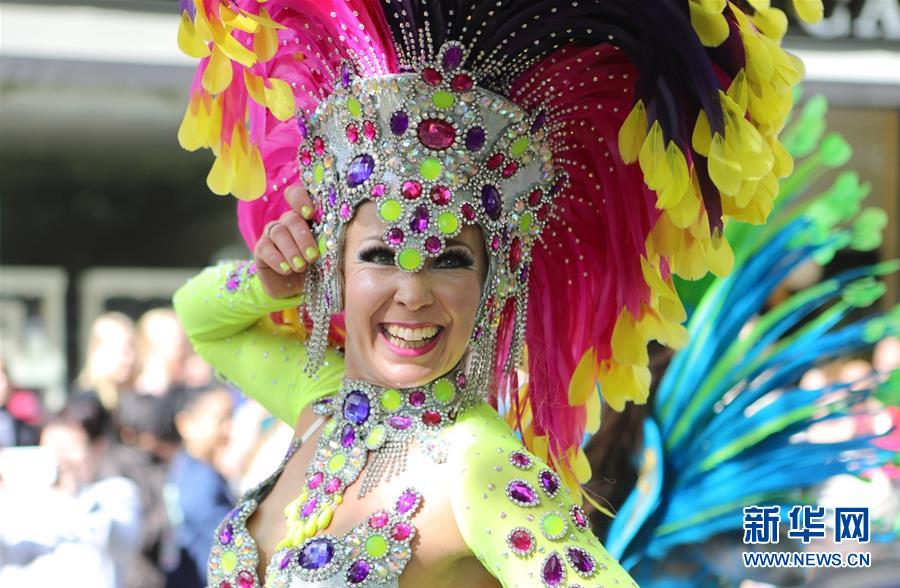 6月10日,在芬兰首都赫尔辛基,一名身着盛装的桑巴舞者参加狂欢节游行。赫尔辛基10日举行第27届桑巴狂欢节,来自芬兰全国各地的桑巴舞爱好者在市中心举行盛大的歌舞游行,吸引民众前来观看。 新华社记者张璇摄