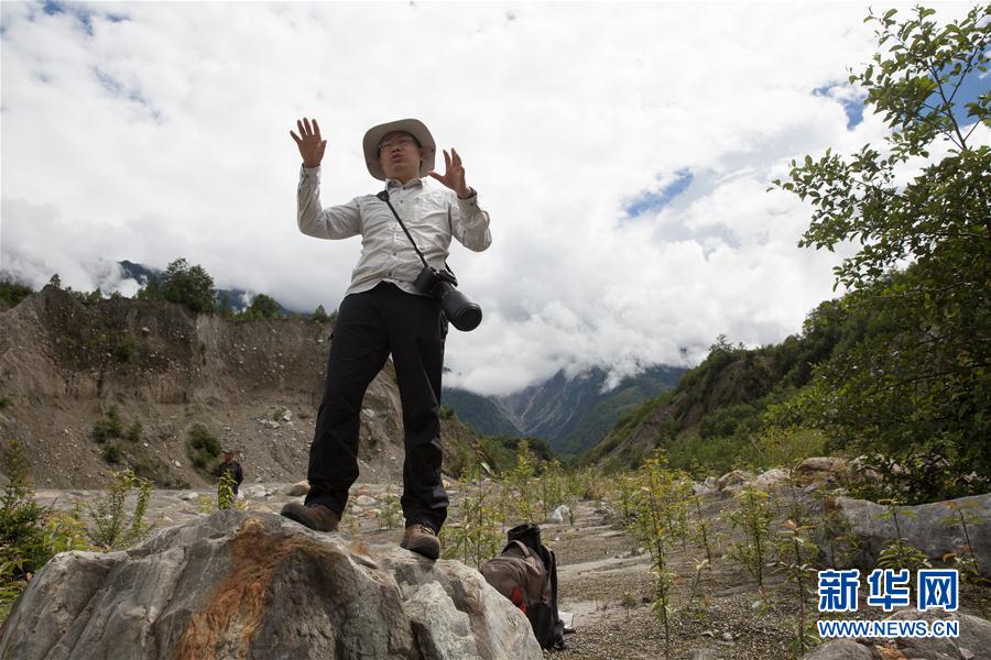 中国科学院成都山地灾害与环境研究所副所长陈晓清在西藏自治区波密县易贡乡扎木弄沟易贡滑坡现场向记者介绍考察情况(6月28日摄)。