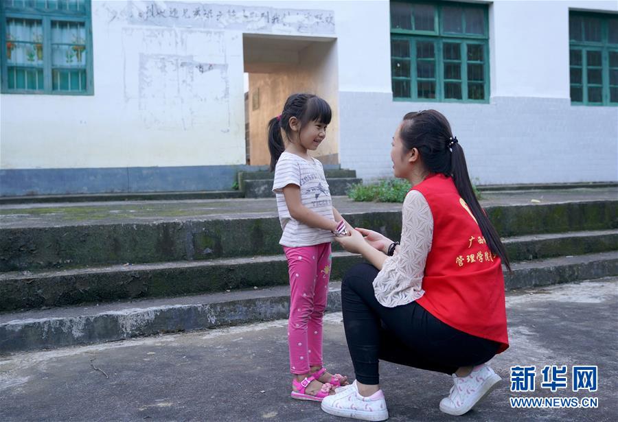 7月13日,在广西柳州市融安县泗顶镇寿局村,志愿者黎海媚(右)和5岁的韦严仿在交流。新华社记者 李鑫 摄