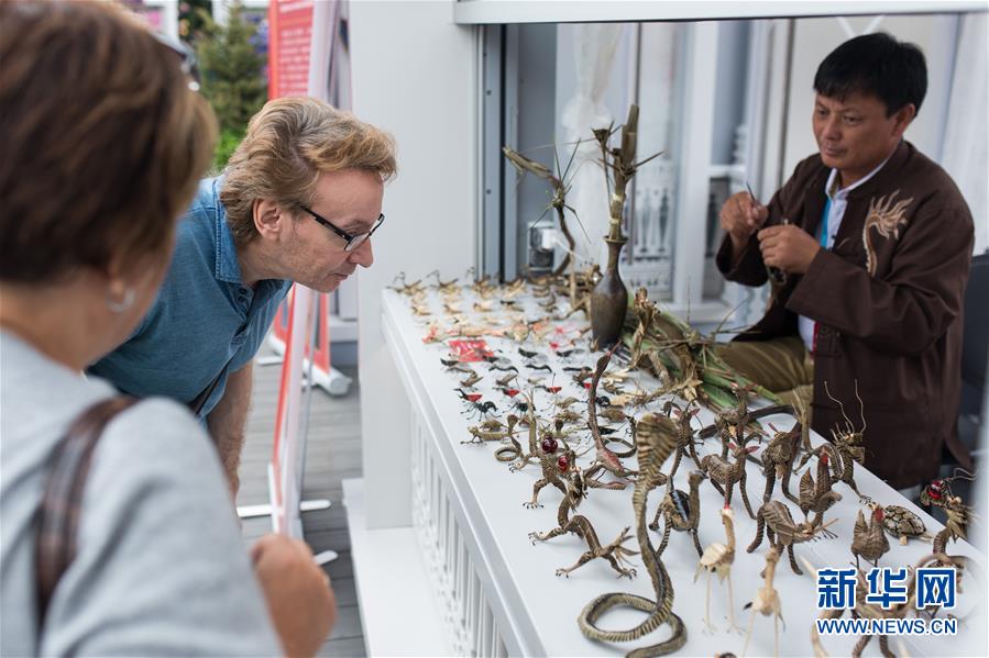 7月17日,在俄罗斯首都莫斯科革命广场,人们观看庙会上售卖的草编产品。作为北京市东城区与莫斯科中央区在国际友好城区框架下系列交流活动的重要组成部分,“地坛庙会全球行·2017莫斯科之旅”活动于15日在革命广场开幕,为期4天。期间,包括书法、绘画、剪纸、面人、雕漆、景泰蓝、泥人张等40多种中国传统文化代表项目以展台和表演的形式集体亮相,向当地民众和游客展示中国文化的独特魅力。新华社记者 白雪骐 摄