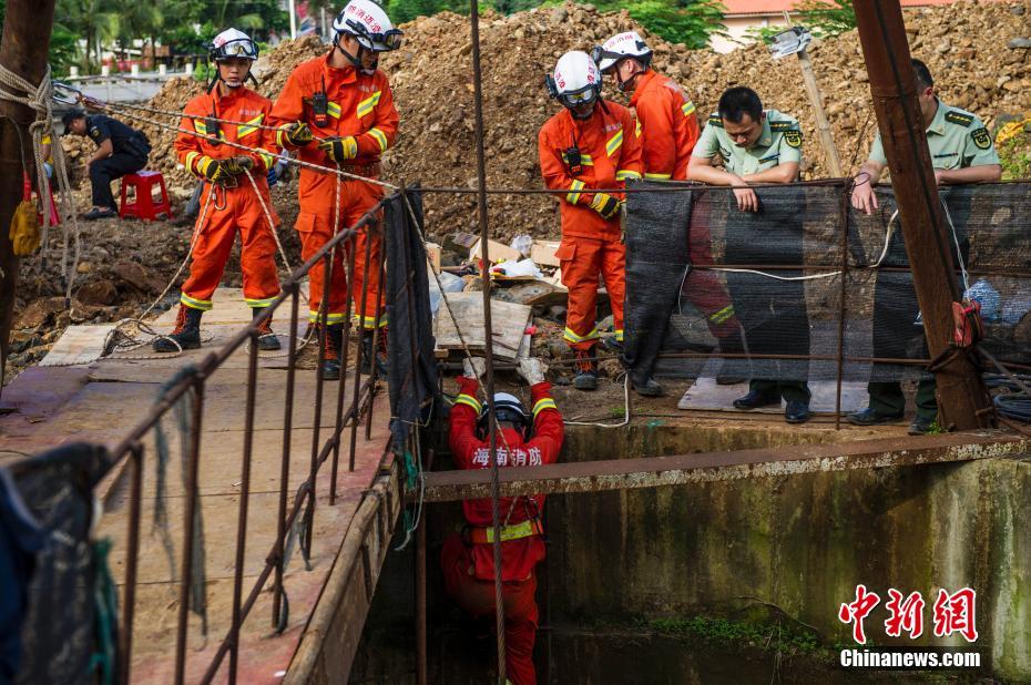 7月21日,海南省澄迈县老城镇美伦路与工业大道交汇处发生施工塌方事故,导致两名工人被困地下,救援工作正在紧张进行中。据了解,该工程为铺设市政污水管道,施工单位为广西建工联合建设工程有限公司,施工班组六名工人负责具体施工。事发现场有三名工人,有两名工人在地下作业(负责铺设管道),一名在平台上作业。图为事发救援现场。中新社记者 骆云飞 摄
