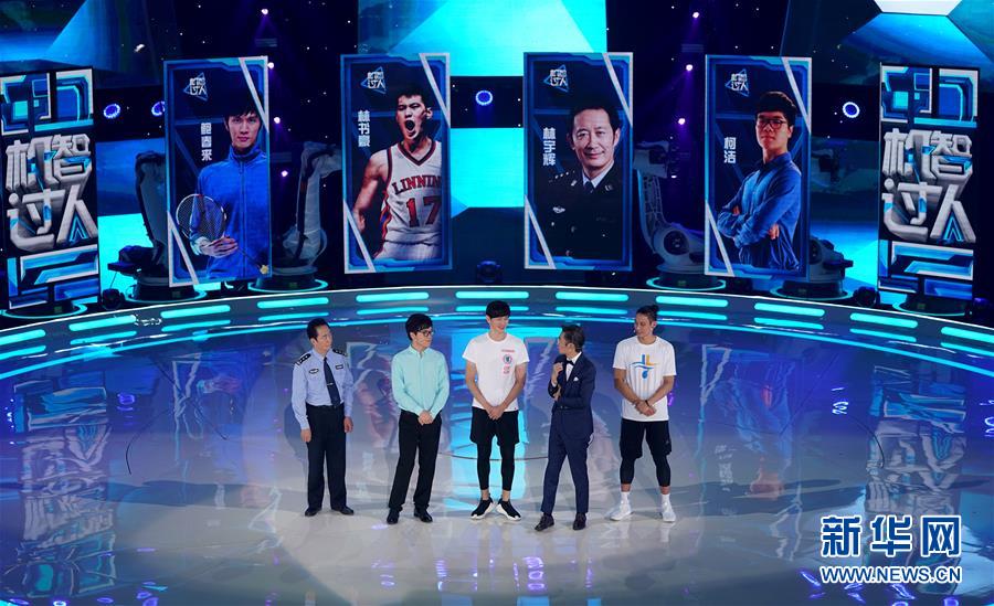 8月2日,《机智过人》节目主持人高博(右二)采访篮球运动员林书豪(右一)、羽毛球运动员鲍春来(中)、围棋选手柯洁(左二)和山东省公安厅首席模拟画像专家林宇辉(左一)组成的“最强人类”战队。