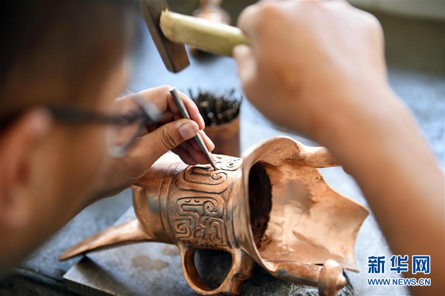 8月2日,云南兴达工艺品美术有限公司工艺师在錾刻斑铜工艺品。