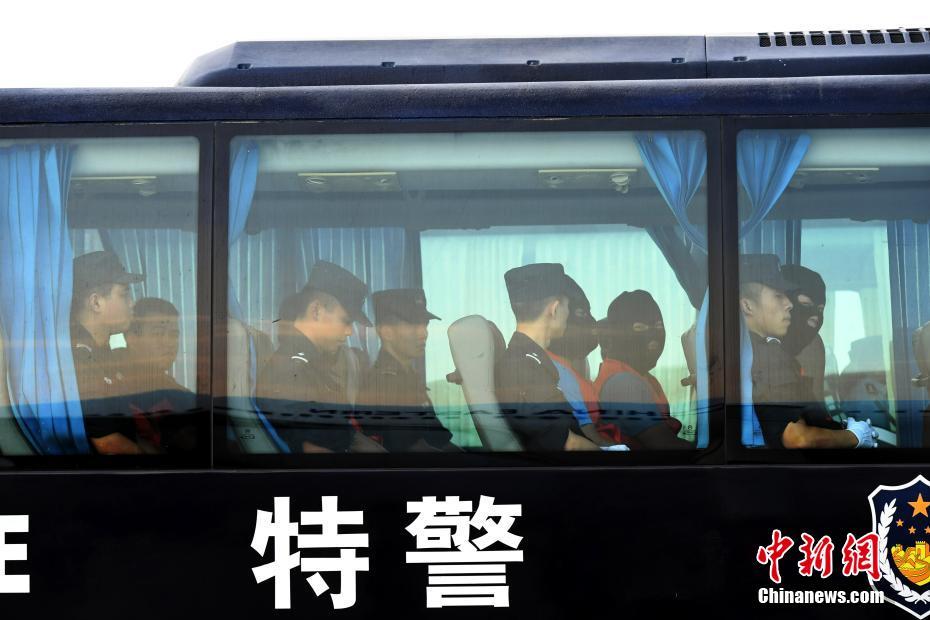 8月3日18时40分,一架印度尼西亚雅加达的航班抵达成都双流国际机场。58名嫌疑人被四川警方从印度尼西亚押解回国,6辆特警车辆将这批嫌疑人即刻转送案源地四川眉山市进一步调查处理。图为犯罪嫌疑人在押解车上。中新社记者 安源 摄