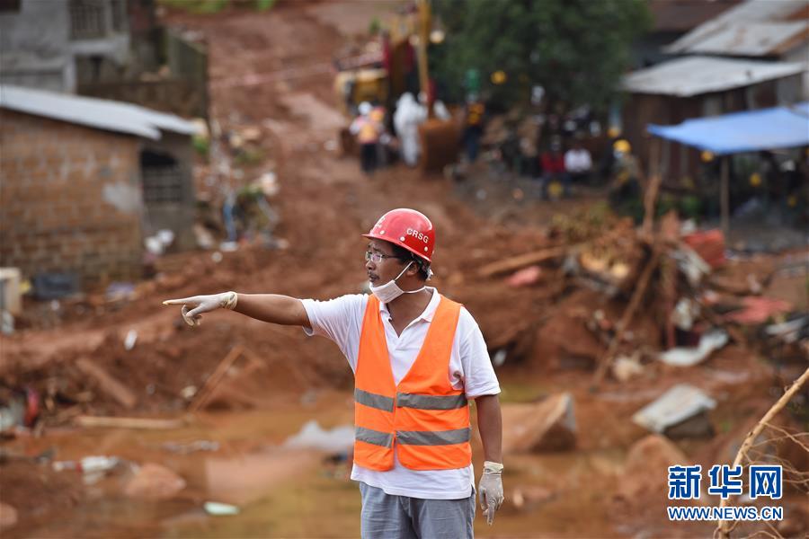 8月17日,在塞拉利昂弗里敦市,中铁七局员工王博在泥石流灾害现场参与救援工作。塞拉利昂首都弗里敦市14日清晨因强降雨引发洪水和泥石流灾害,导致舒格洛夫山部分山体滑坡。中铁七局及中铁国际两家中资企业第一时间参与救援的中外员工数超过40人,是最早赶赴现场的外国救援队。新华社记者陈诚摄