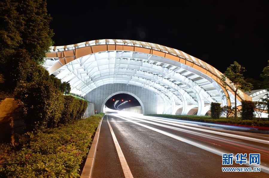 厦门翔安海底隧道出入口遮光棚亮灯(8月25日摄)。金砖国家领导人第九次会晤前夕,进出厦门本岛的4座跨海大桥和1个海底隧道正式亮灯,将厦门与外界连接的通道装点一新,成为厦门夜景的一张新名片。新华社记者 宋为伟 摄