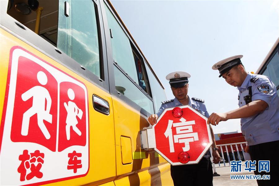 8月29日,重庆市永川区交巡警在对校车进行安全检查。新学期来临,重庆市永川区公安局交巡警支队对辖区校车进行全面检查,确保学生们安全出行。 新华社发(陈仕川 摄)