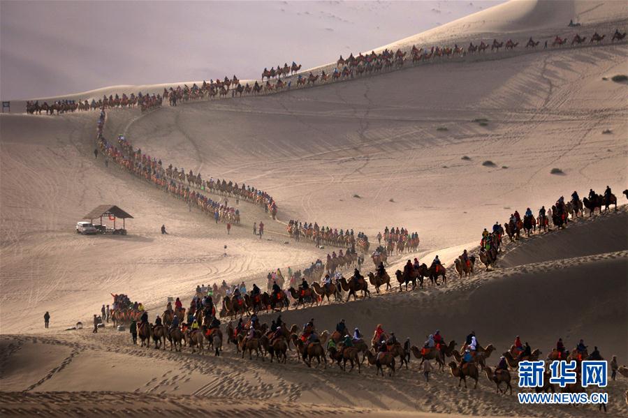 10月2日,游客在甘肃省敦煌市鸣沙山月牙泉景区游览。