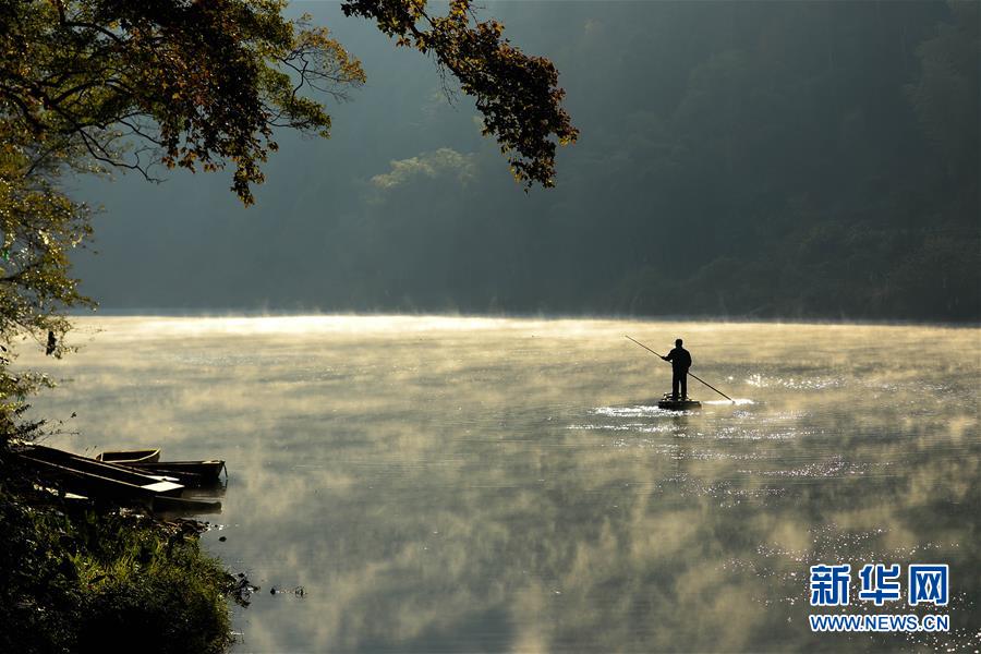 11月24日清晨,在安徽省黄山市祁门县渚口乡鲁溪湾,一名村民撑着竹排过河。 新华社发(李建波 摄)