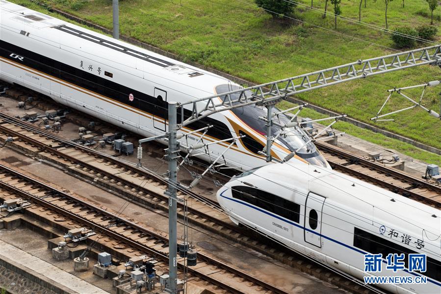 这是2017年9月21日,一列“复兴号”动车组在京沪高铁线路上与“和谐号”动车组交会。 新华社发(苏阳 摄)