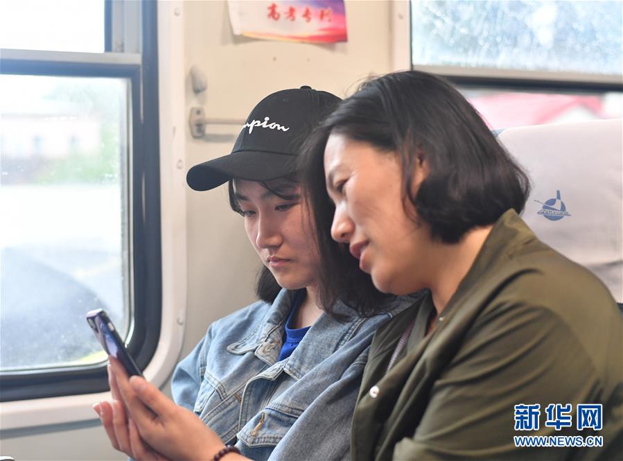 6月5日,大杨树二中高三学生鲁贵怡(左)与妈妈乘坐“高考专列”。新华社记者王松摄