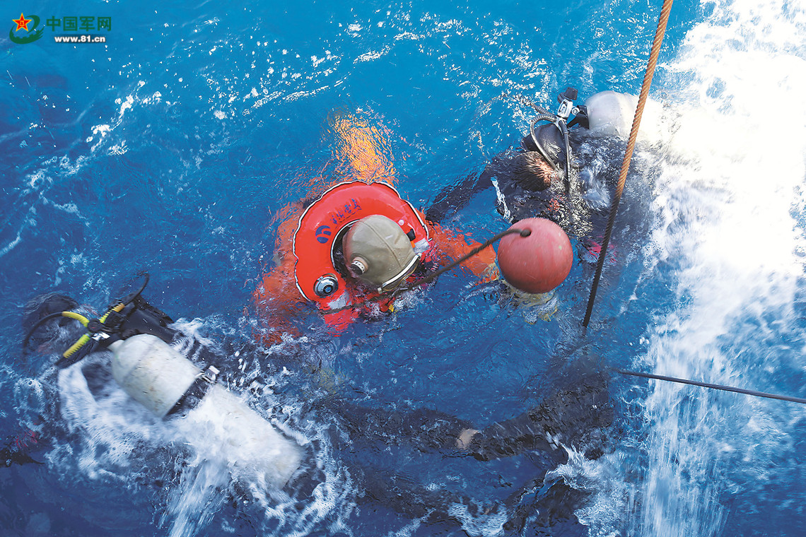 “失事”潜艇艇员在潜水员协助下成功上浮。