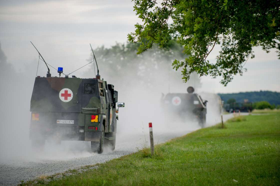 联合指挥中心接到情况通报后不久,石子路上远远扬起尘埃,中德两军数辆轮式、履带装甲救护车先后赶到事发现场,急救人员下车迅速开始一线急救,转运伤员。