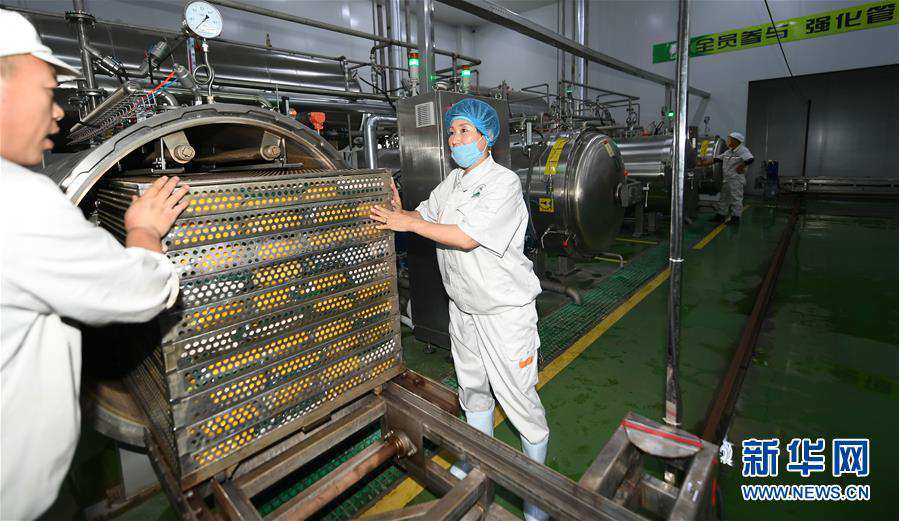 9月26日,隋书侠(右)在加工车间查看玉米杀菌情况。 新华社记者 王昊飞 摄