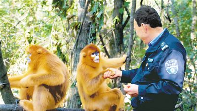 护林员同不少野生动物成了“好朋友”。图为护林员同野生金丝猴握手。