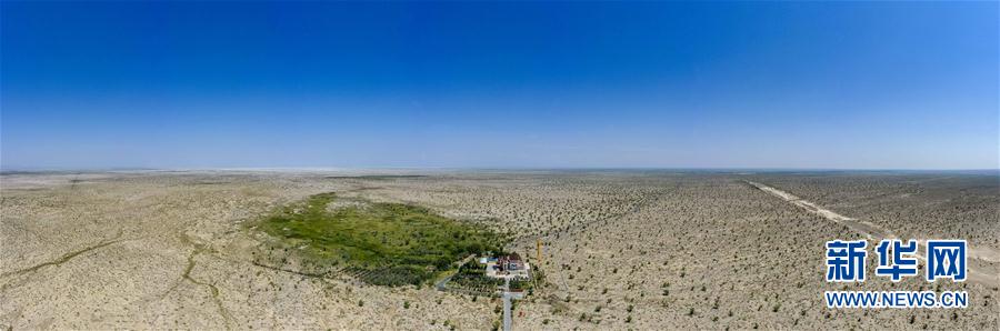 这是位于新疆艾比湖湿地国家级自然保护区内的阔克塔拉管护站(7月14日摄,无人机全景照片)。 新华社记者 胡虎虎 摄
