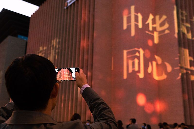 9月29日,一名市民用手机拍摄四川省图书馆灯光秀。