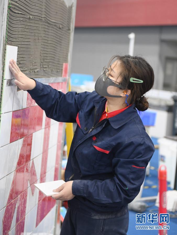 12月10日,选手在比赛中贴瓷砖。