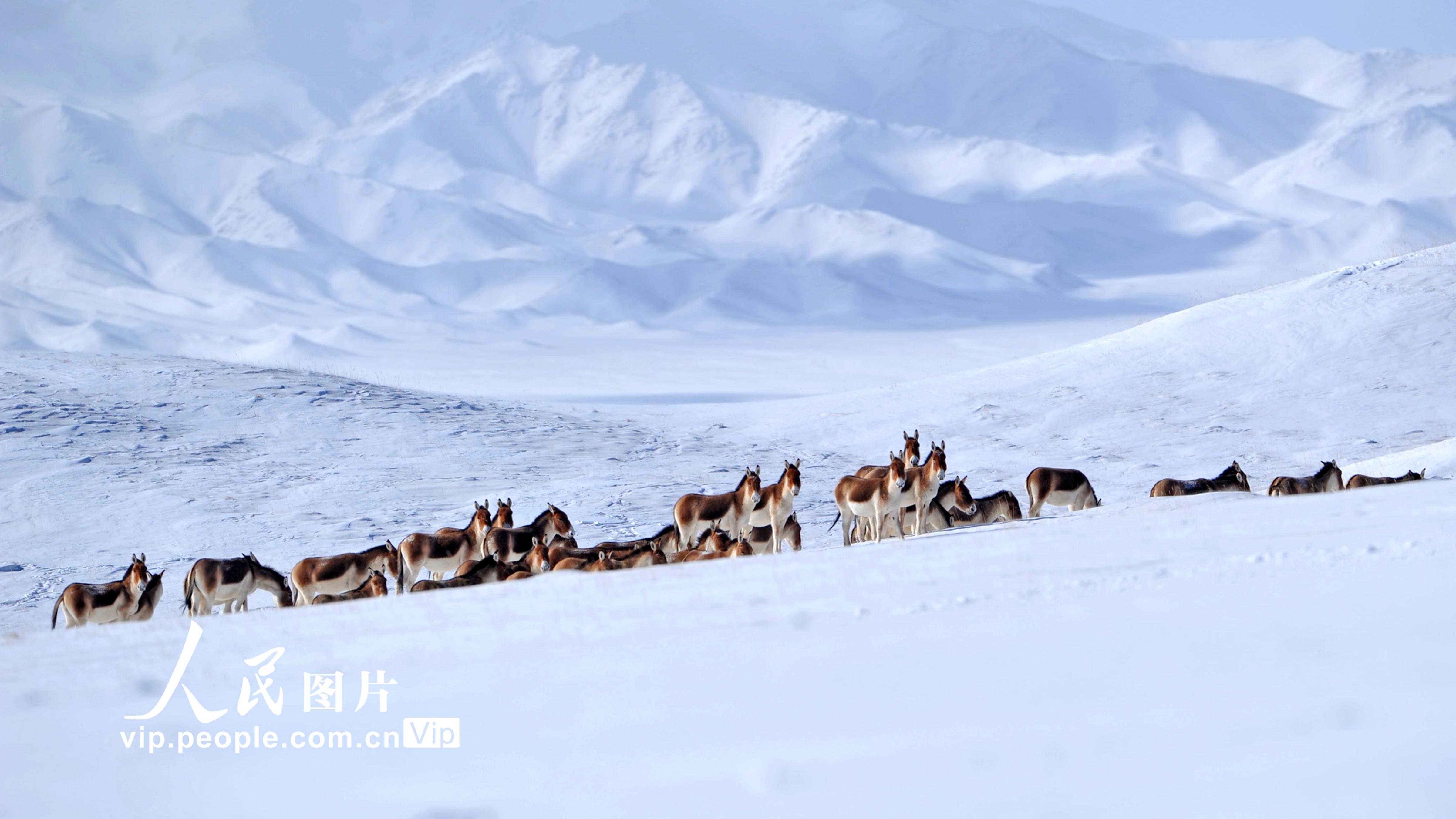 2021年1月16日,甘肃省酒泉市阿克塞哈萨克族自治县境内的祁连山腹地、哈尔腾高原降雪过后,蓝天白云下的雪域高原景色优美,成群的国家一级野生保护动物藏野驴身背寒雪,转场到积雪覆盖较浅的地方觅食。国家级野生保护动物野牦牛、藏原羚等三五成群与之相伴觅食栖息,为雪域高原增添了不少生机与活力,实为壮观。高宏善摄(人民图片网)