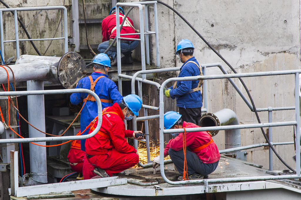 2021年3月16日,湖北省宜昌市工人在三峡北线船闸施工。