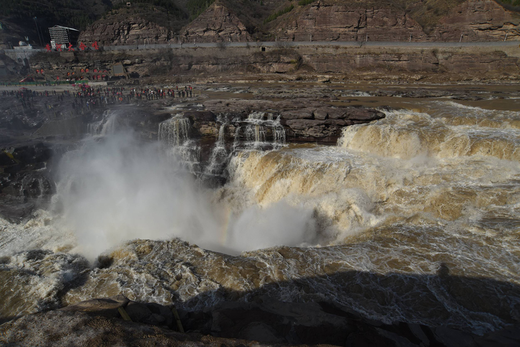 2021年3月23日,位于晋陕大峡谷之间的黄河壶口瀑布景区天气晴好,飞流直下的黄河壶口瀑布飞溅起弥天水雾,在阳光的照射下,形成“彩虹通天”景观,与奔腾咆哮的黄河水相映成趣,美不胜收。吕桂明摄(视觉中国)