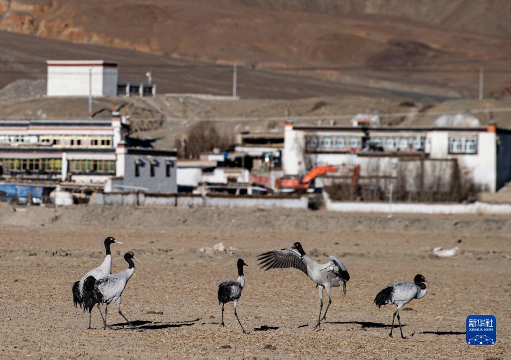 在西藏雅鲁藏布江中游河谷拉孜县农区越冬的黑颈鹤(1月23日摄)。