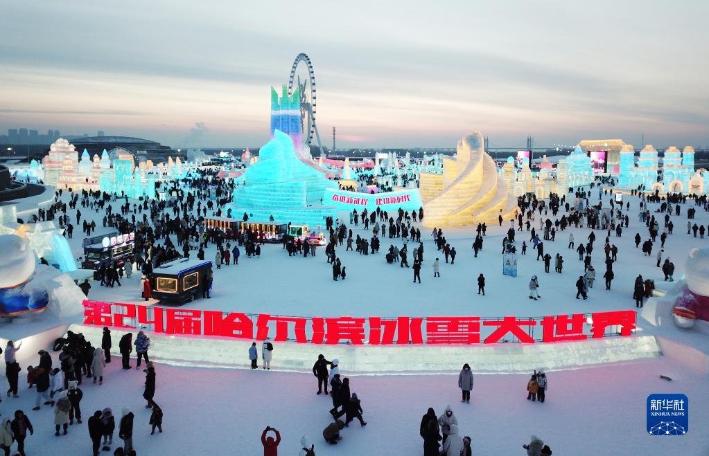 1月25日,游客在哈尔滨冰雪大世界园区游玩(无人机照片)。