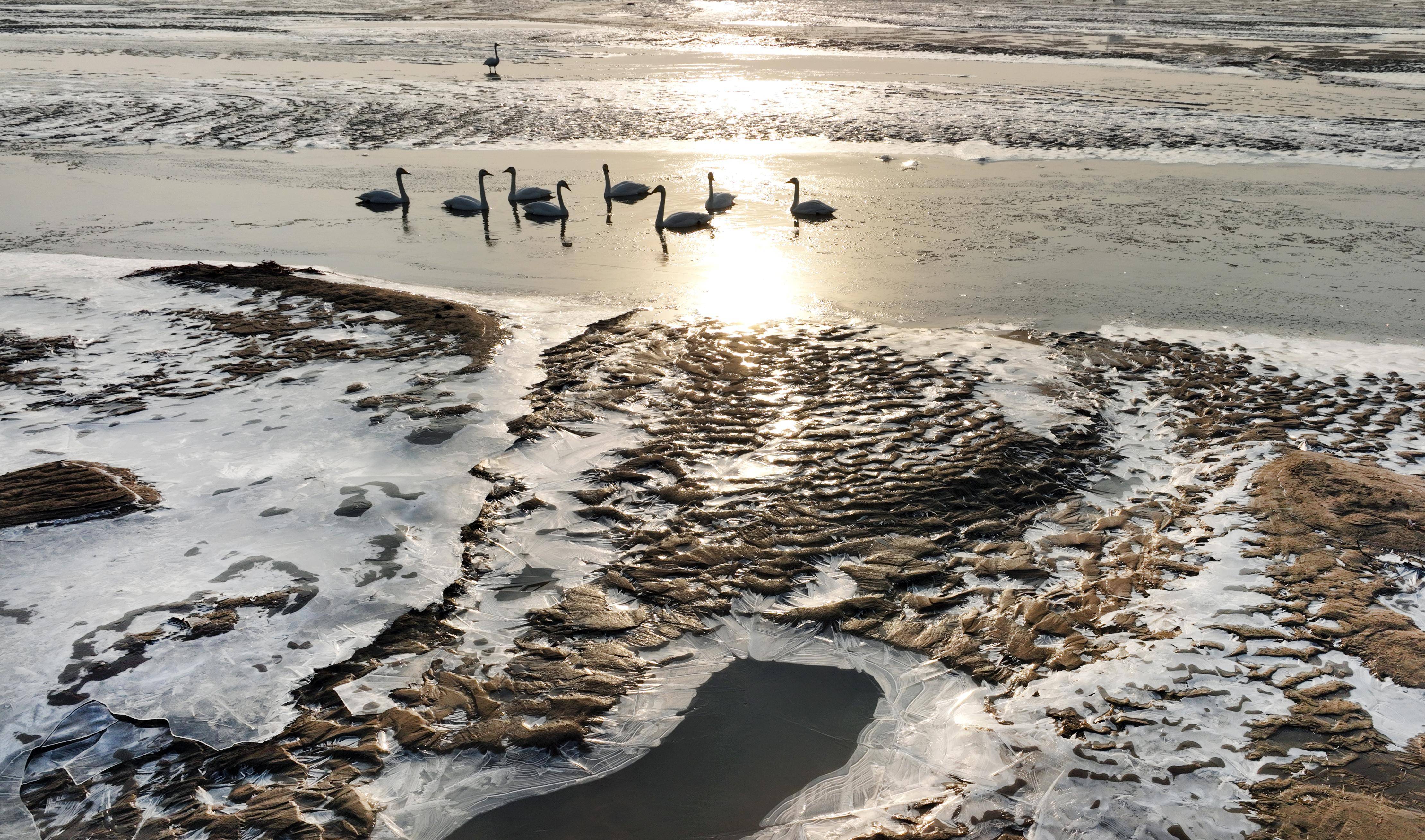 近日,黄河西岸的合阳黄河湿地自然保护区内,天鹅今年首次规模出现,数量近千只。