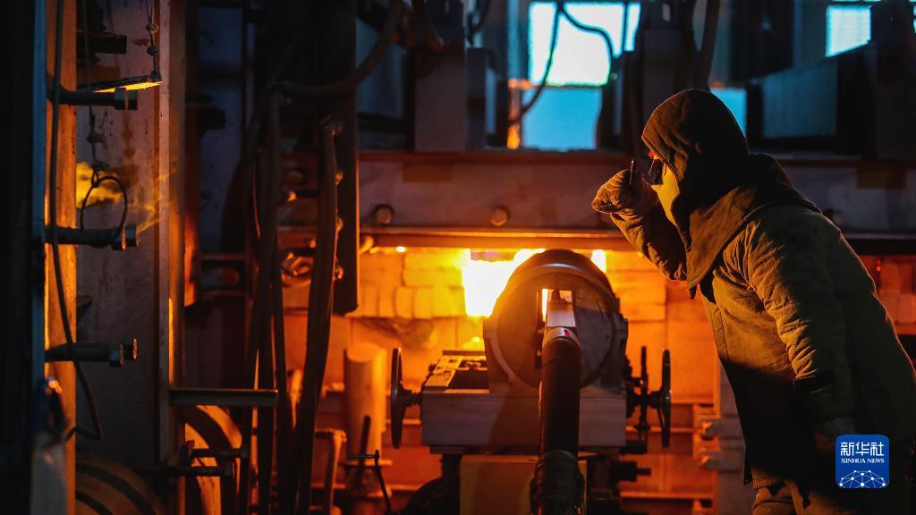 5月1日,在河南省商丘市睢阳区一家玻璃生产企业,工人在车间观察玻璃液熔制情况。
