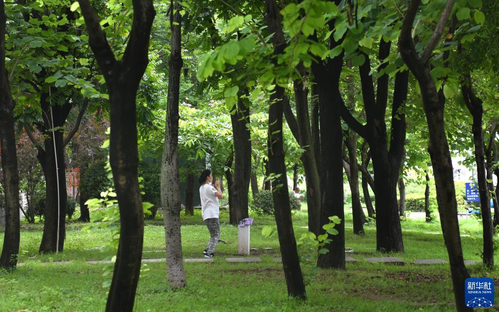 6月23日,市民在广州珠江边的树林里锻炼。