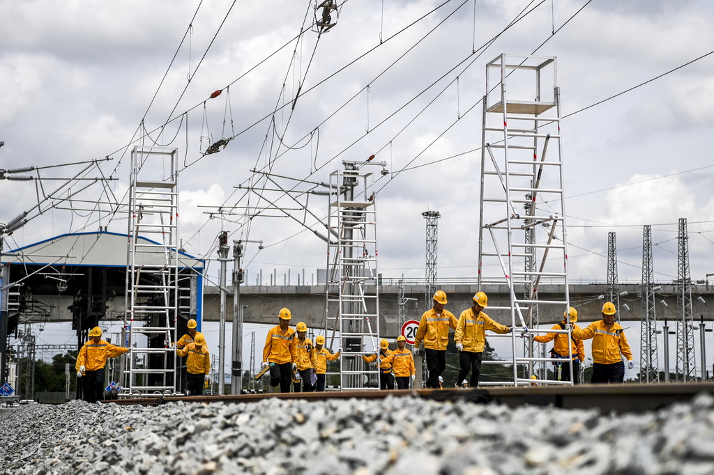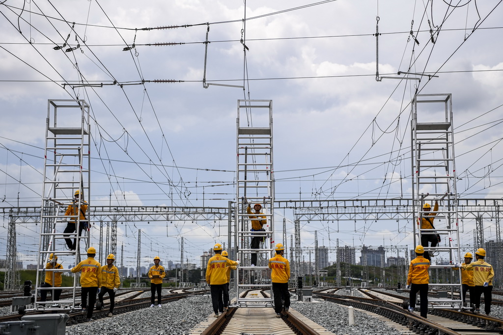 8月27日,中国铁路南宁局集团有限公司南宁供电段的接触网工对南宁第二动车所存车线内26条股道中达到检调标准的股道进行检查,为即将全线开通的贵南高铁做准备。